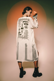 The pattern symbolizes awareness and growth — eyes, suns, and sacred lines representing protection, light, and intuition. With its wide sleeves and relaxed silhouette, it’s a statement of harmony and presence, made for both grounding and expression.